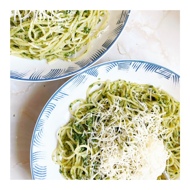 The more parmesan you have the drier your pesto will be. I used 100g of parmesan in my recipe and it was drier than expected. Although delicious I would probably use 75-80g next time for a smoother consistency. Don’t forget you can always add but you can’t take away.